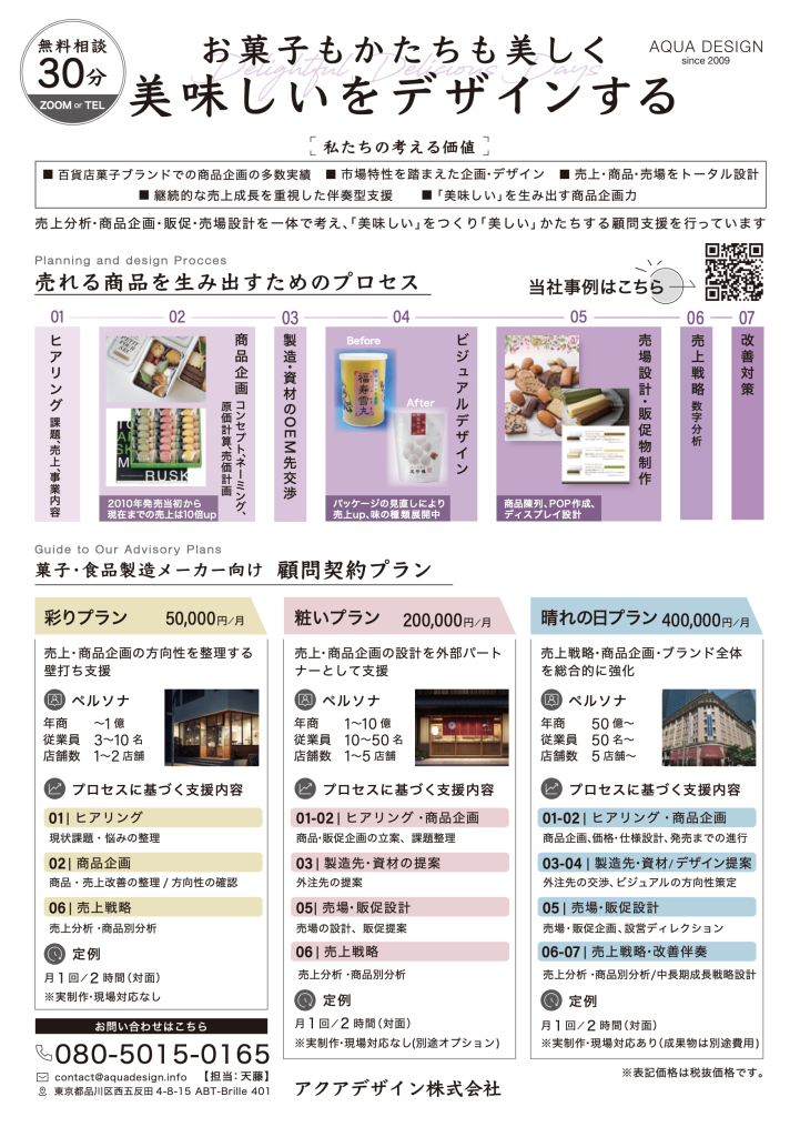 美味しいをデザインする顧問支援プランのご案内 おいしいデザイン(食) 2026/02/19 百貨店菓子ブランドでの商品企画の多数実績を活かし、市場特性を踏まえた商品企画/デザイン、 また継続的な売り上げ成長を重視した伴奏型の支援を行います。 この度、企業やブランドのニーズに応じて選択いただける3つの顧問契約プランをご用意いたしました。 ペルソナ設計や支援内容に基づき、最適なプランをご検討いただけます。 詳細は添付チラシをご覧ください。